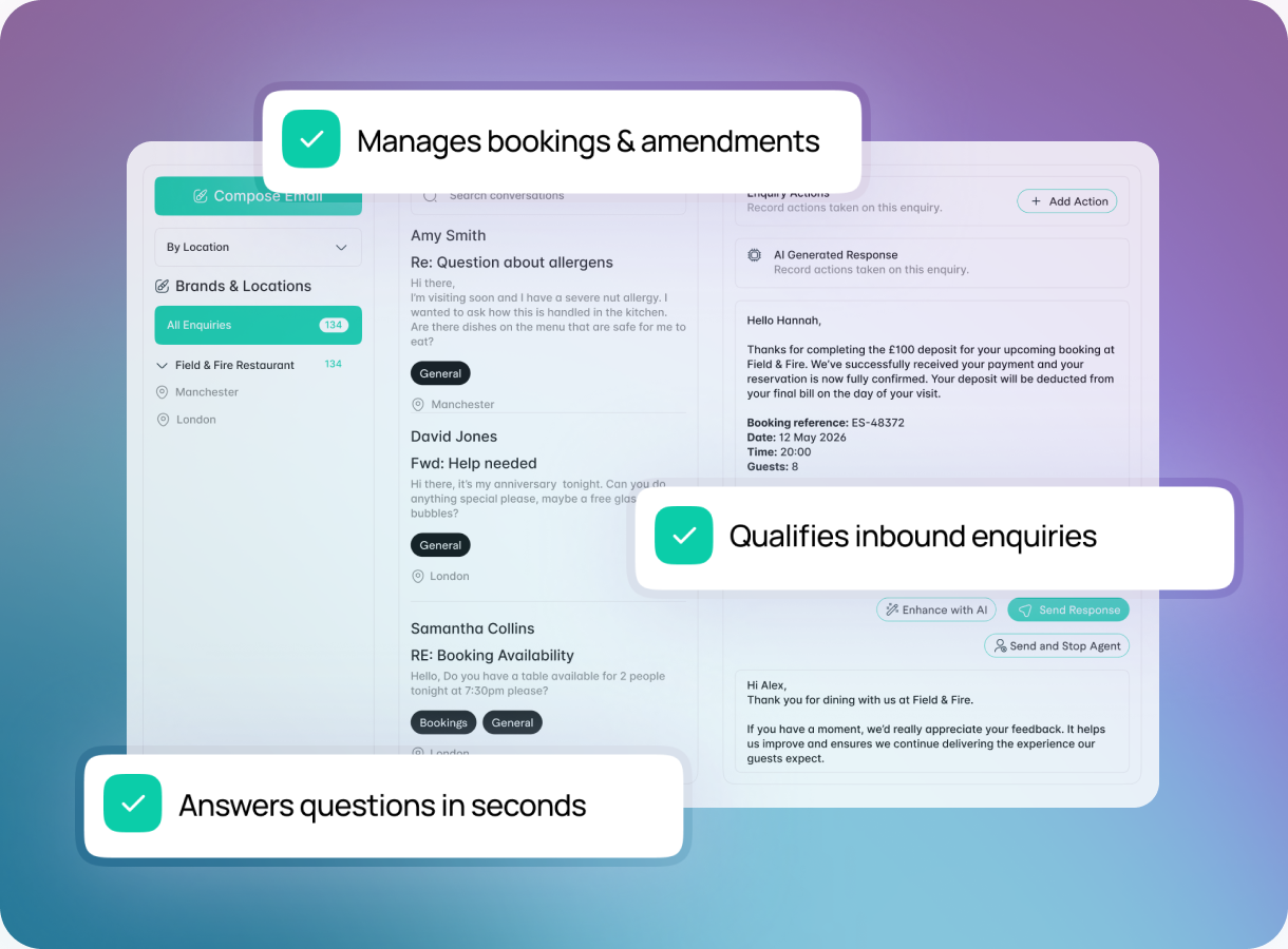 Hospitality-native AI concierge that provides guests with instant responses from qualifying enquiries, taking bookings, handling lost & found and FAQ’s in real time.
